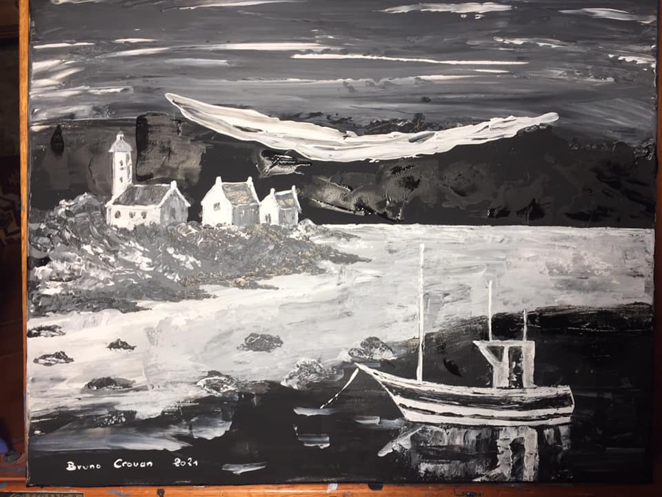 Peinture acrylique au couteau sur toile 40 x 50 cm : "Port de pêche breton ... Avis de tempête en Finistère." (Octobre 2021)