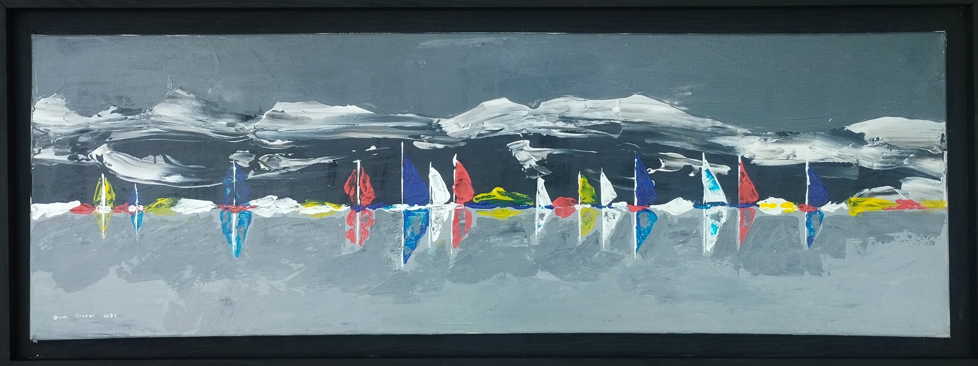 Acrylique au couteau sur toile 120X40 :"Régate au pied des montagnes enneigées de Corse." (2021)