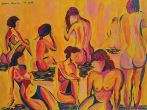Peinture acrylique sur toile 60 x 60 cm : « Les baigneuses… abandonnées … sur une plage confinée. » ( Novembre 2021).