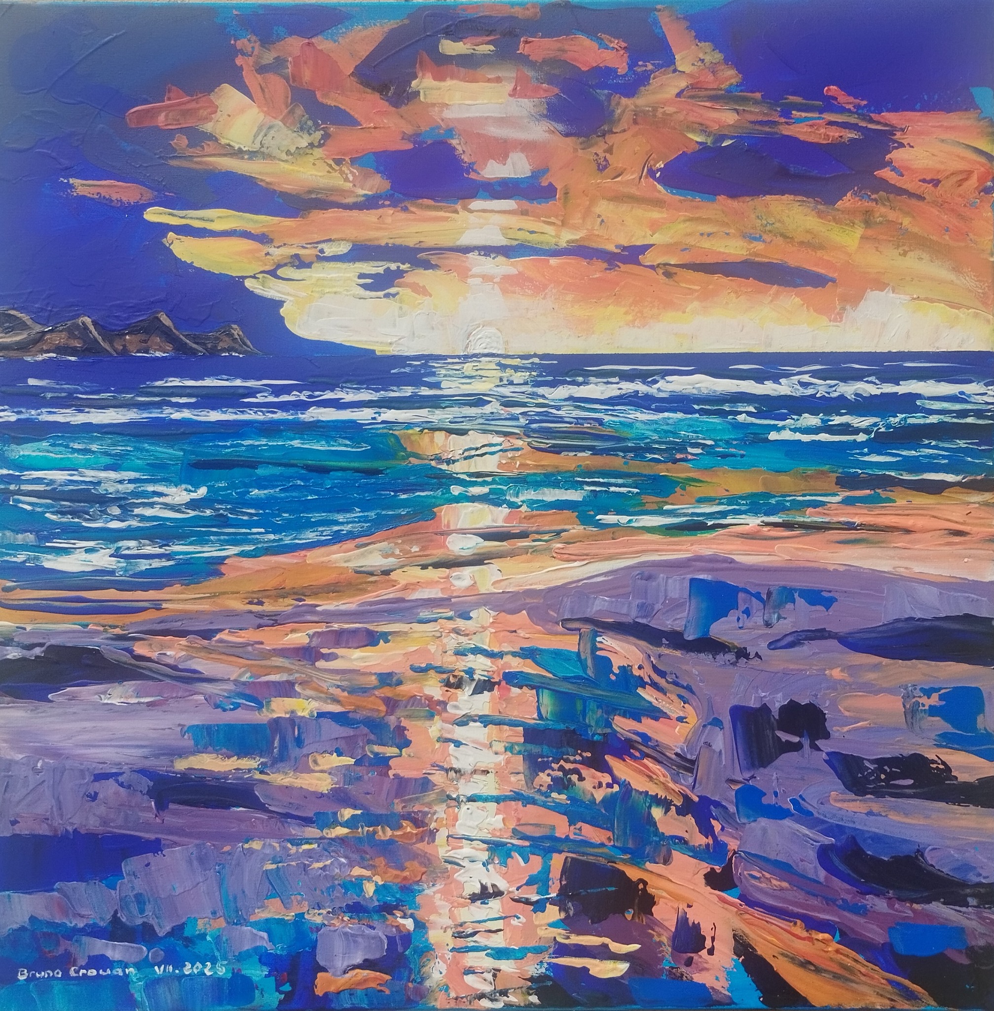 Dans cette œuvre éclatante de couleurs et de matière, le ciel embrase la mer dans un dernier baiser de lumière. Le soleil couchant se reflète comme une flamme vivante sur les vagues et le sable humide, créant une symétrie presque onirique entre ciel et terre. Le pinceau, vif et instinctif, capte l’énergie du moment — ce passage fugace entre le jour et la nuit où tout semble suspendu. C’est une célébration de l’instant, du mouvement, et de la chaleur d’un horizon qui s’éteint en beauté.