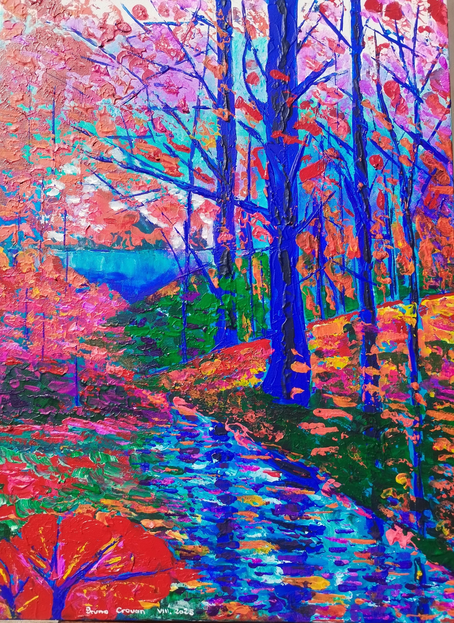 Cette peinture exprime la vitalité brute de la nature à travers une explosion de couleurs vives et contrastées. Le spectateur se perd dans cette forêt où les troncs bleu électrique se dressent comme des colonnes de lumière, tandis que les feuillages flamboyants aux tons rouges, roses et orangés semblent embraser le paysage. La rivière, miroir chatoyant de toutes ces teintes, devient un chemin de lumière mouvante qui guide le regard vers l’infini.