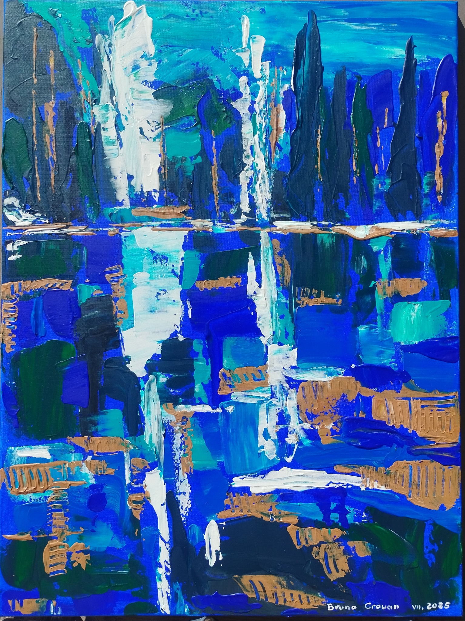 Peinture acrylique au couteau sur toile 60 x 80 cm. : forêt immergée au bord du lac, reflets d'azur, écho du silence, lumière sur l'eau, symphonie bleue, verticale bleue..." Cela évoque l'eau et une certaine mélancolie lumineuse comme si on se promène au bord d'un lac bleu profond." ( Juillet 2025).