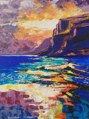 Cette toile capte l’instant où la nature se déchaîne en silence. Le ciel incandescent embrase la mer et les falaises, tandis que les vagues, teintées de turquoise et d’or, viennent mourir dans une lumière presque irréelle.