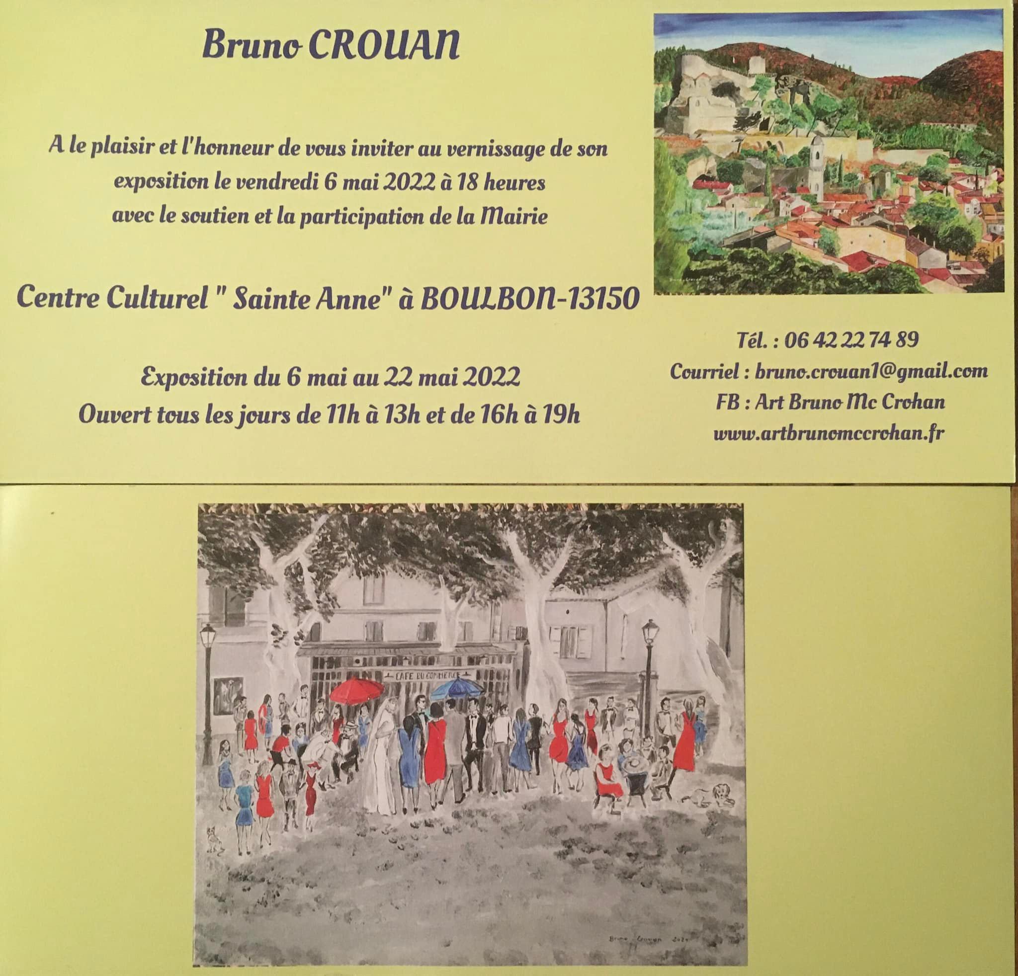 Save the date # vendredi 6 mai 2022 à 18 h # Centre Culturel Sainte Anne à Boulbon # Big Vernissage # exposition du 6 au 22 mai # soutien et participation de la Mairie # Boulbon- 13150