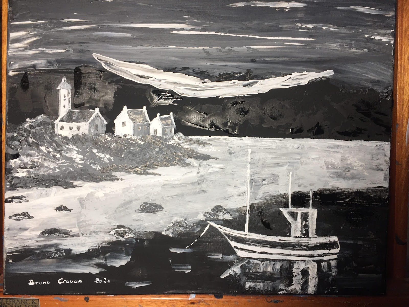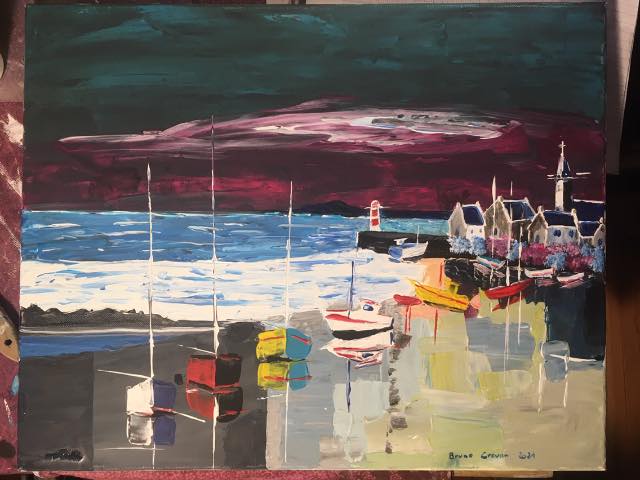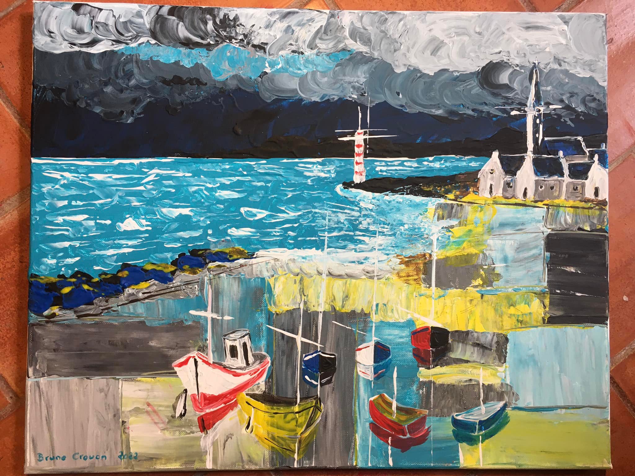 Peinture acrylique au couteau sur toile 40 x 50 cm : "Port de pêche breton ... Avis de tempête en Finistère." (Octobre 2021)