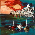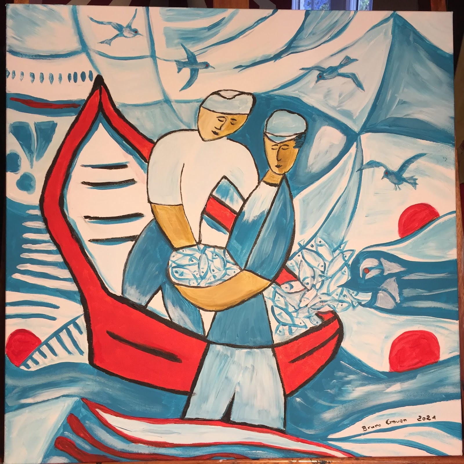 Peinture acrylique sur toile 50 x 50 cm : "Les Pêcheurs et la Barque." (2021)