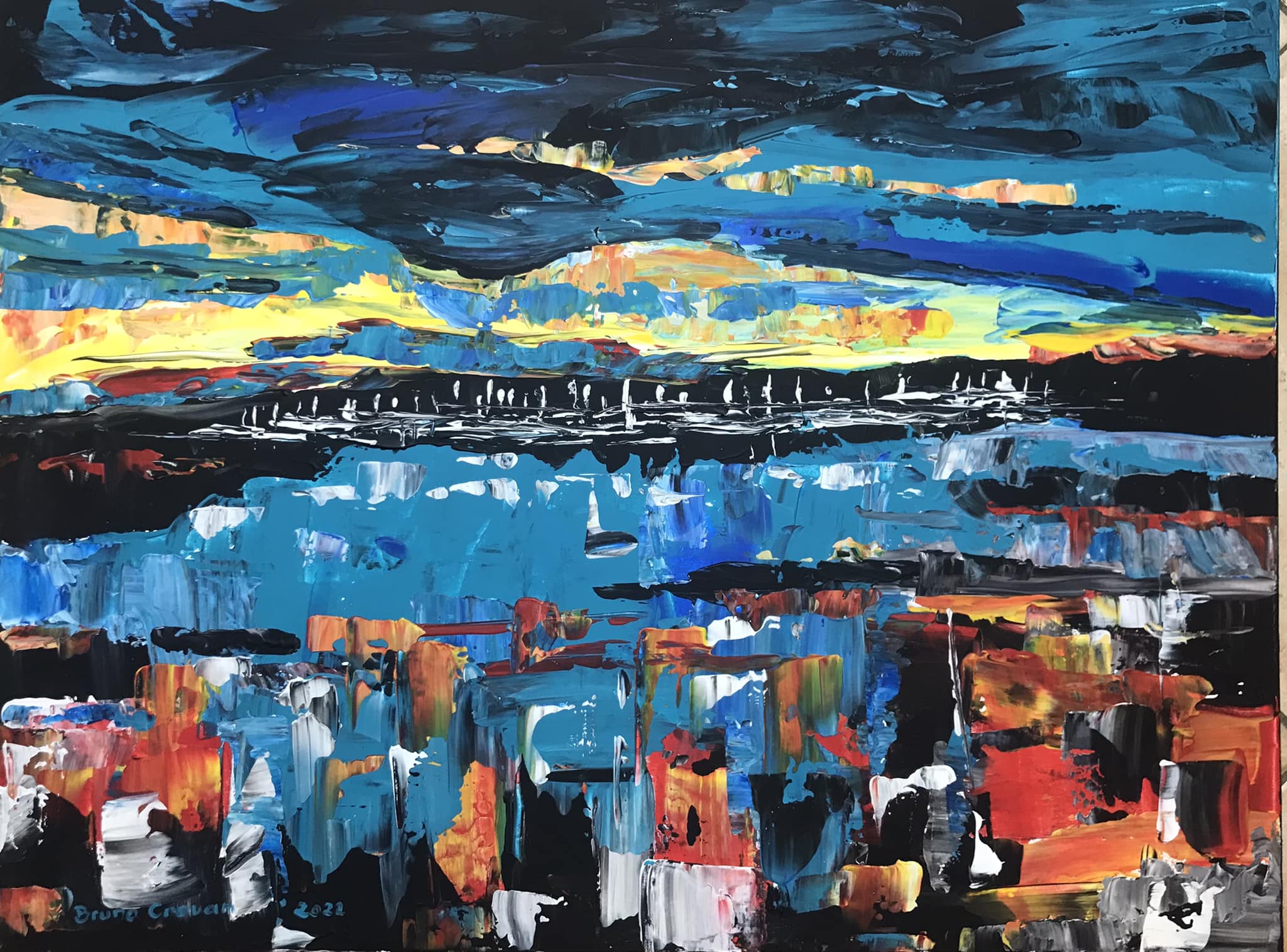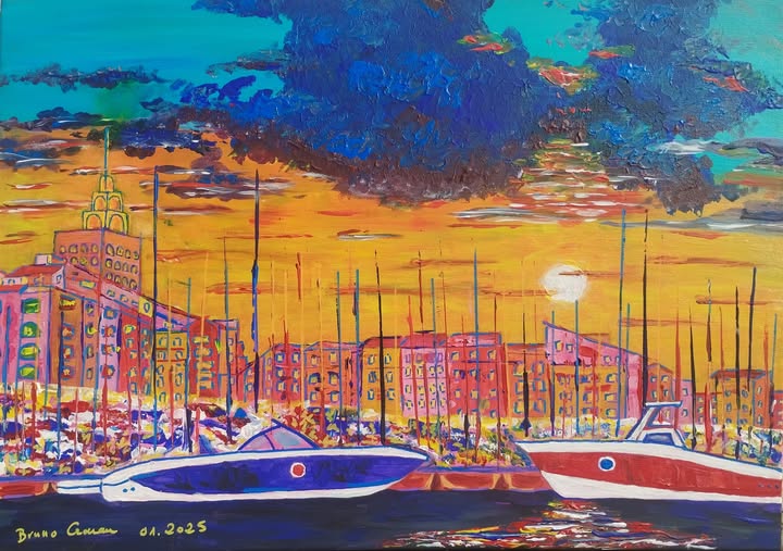 Peinture acrylique technique mixte sur toile 50 x 70 : " Coucher de soleil sur la marina du Cap d'Agde... Tendance Pop Art." ( Janvier 2025).