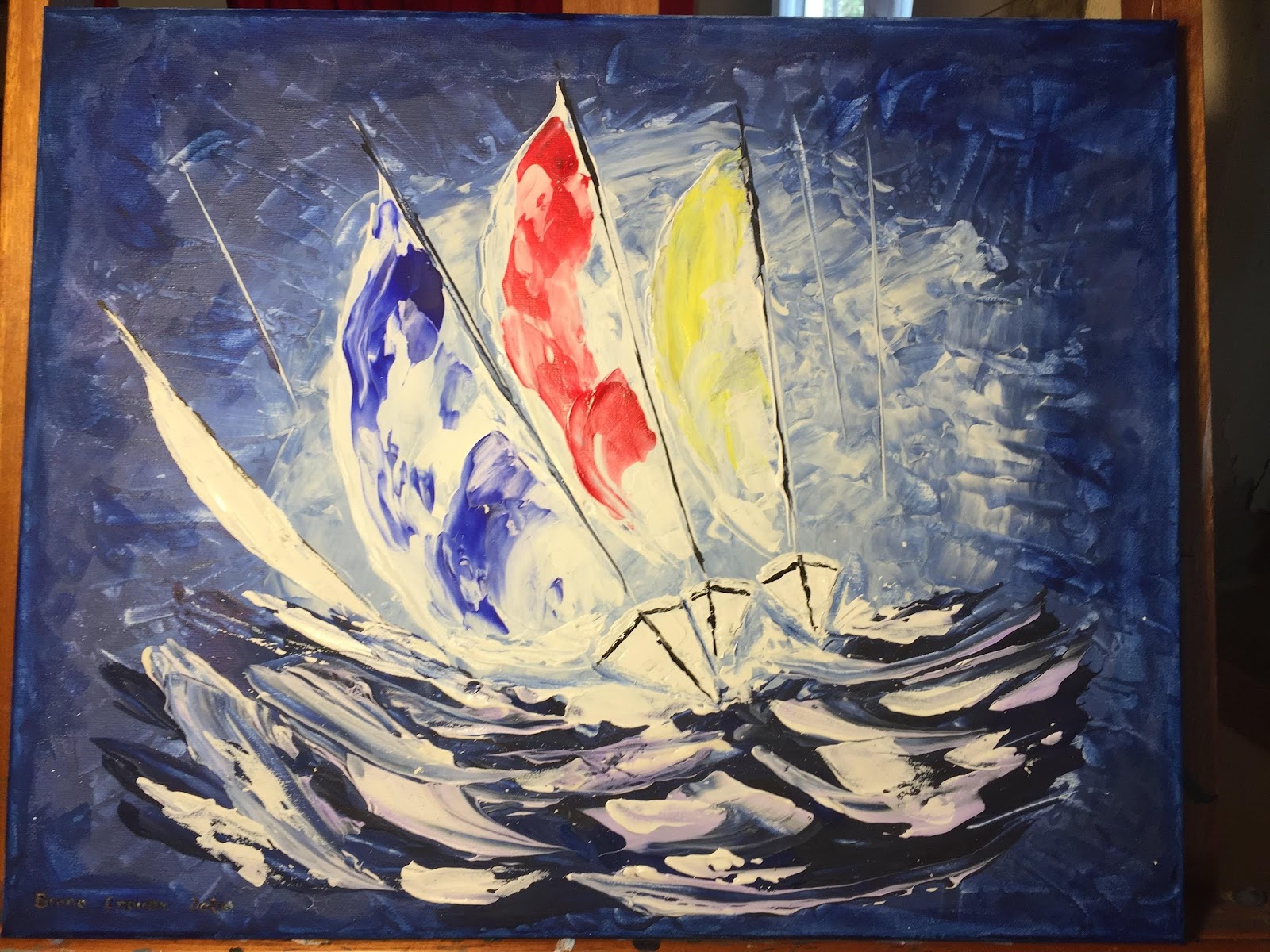 Peinture acrylique au couteau sur toile 50 x 50 cm : « Voiliers mis en panne… » ( Mai 2022).