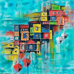 Peinture sur toile avec collages de baguettes de bois, de tissus et de fibres. format 70 x 70 cm : "village lacustre colorée pour rêves de marins." (Avril 2024).