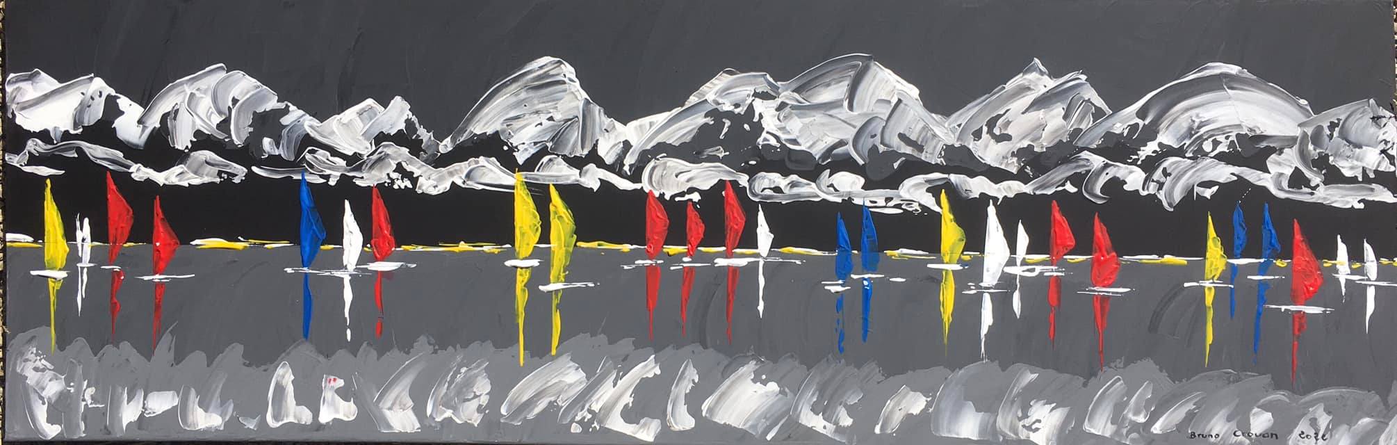 Acrylique au couteau sur toile 120X40 :"Régate au pied des montagnes enneigées de Corse." (2021)