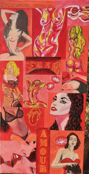 Peinture acrylique patchwork de 14 images sur toile de 100 x 50 cm : " Princesses rouges...Amour...Sexe is Art ! " ( 24 décembre 2024). Joyeux Noël ! 🤶🎅