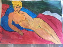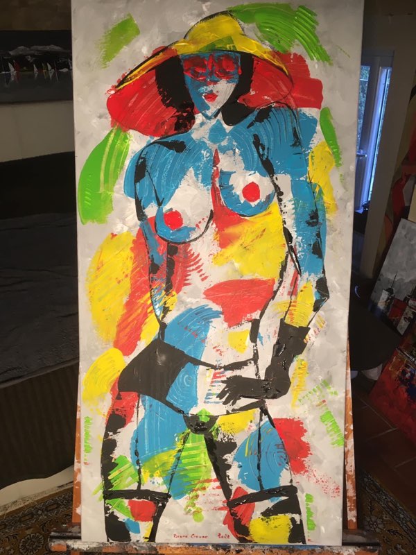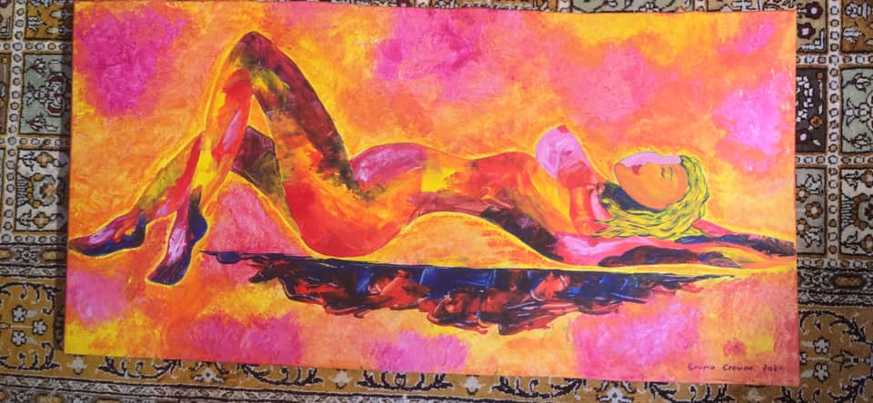 Peinture acrylique mixte sur toile 100x 50 cm : « Naïade confinée… au soleil… sur une plage abandonné… » ( Novembre 2021).