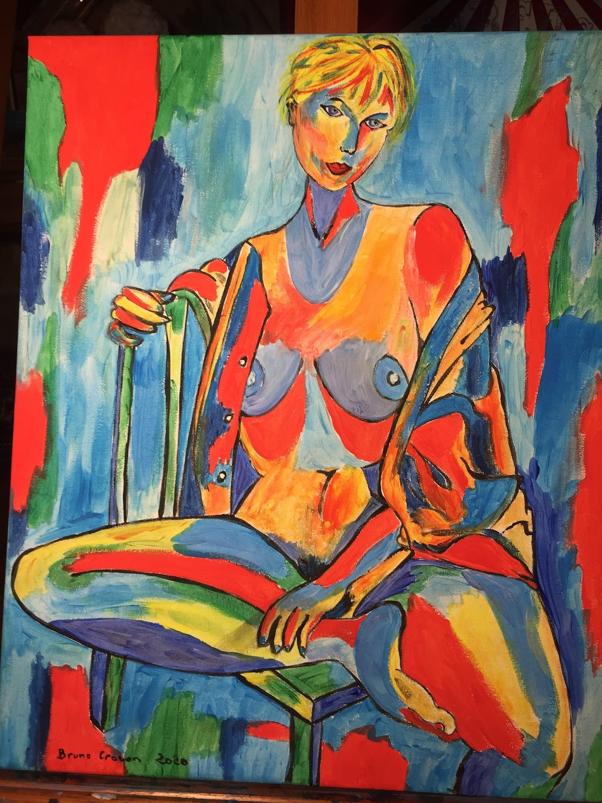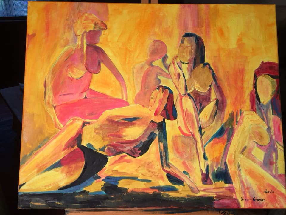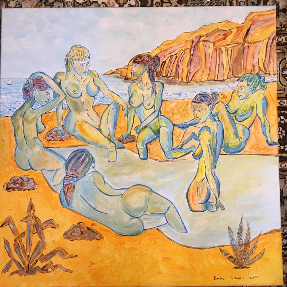 Peinture acrylique sur toile 60 x 60 cm : « Les baigneuses… abandonnées … sur une plage confinée. » ( Novembre 2021).
