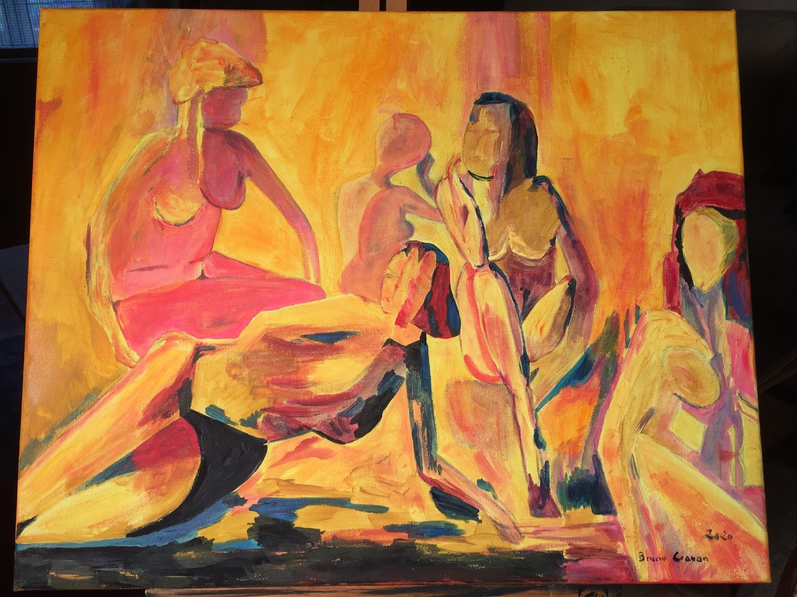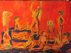 Peinture acrylique sur toile 60 x 80 cm : " Naïades fugitives s'alanguissent nues aux premiers soleils et prennent un bain de feu...Duel au soleil ☀️." Janvier 2025.