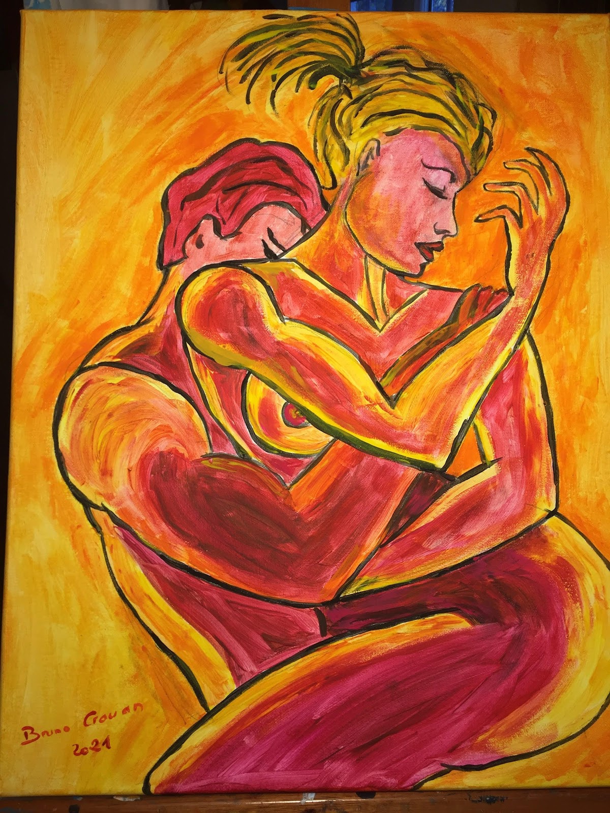 Peinture acrylique sur toile 120 x 40 cm : "Etreinte sous le soleil du confinement d'avril 2021."