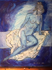 Peinture acrylique sur toile de 100 x 50 cm : " Et Dieu créa la femme ... Salve Regina. Ave, Maria, gratia plena...La planète bleu...L'Amour est bleu." ( janvier 2024).